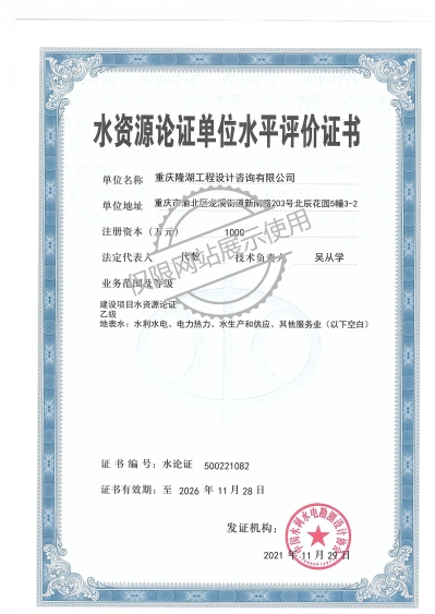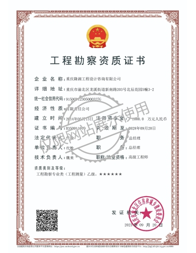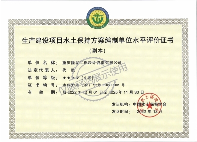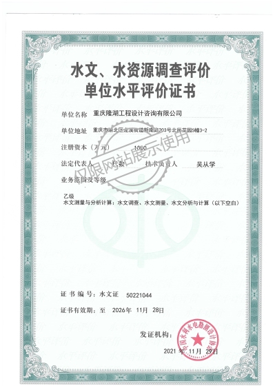 重庆隆湖工程设计咨询有限公司成立于2014年,注册资金1000万元,主要经营范围有:建设项目工程勘察、设计;水土保持工程设计、水土保持方案编制、水土保持监测、水土保持监理、水土保持验收、生态建设项目综合治理;水文、水资源调查评价;建设项目水资源论证;水利工程设计;环保咨询,土壤污染治理与修复;土地调查评估;土地整治、土地复垦、基本农田踏勘;社会稳定风险评估;工程测量;林业规划设计等相关业务。公司现有资质:生产建设项目水土保持方案编制水平评价证书4星、水土保持监测水平评价证书4星;土地规划机构等级证书丙级;农田工程建设勘察设计单位乙级;水资源论证单位水平评价证书乙级、水文、水资源调查评价单位水平评价证书乙级;环境污染治理服务能力评价证书乙级;工程测量乙级、测绘乙级。